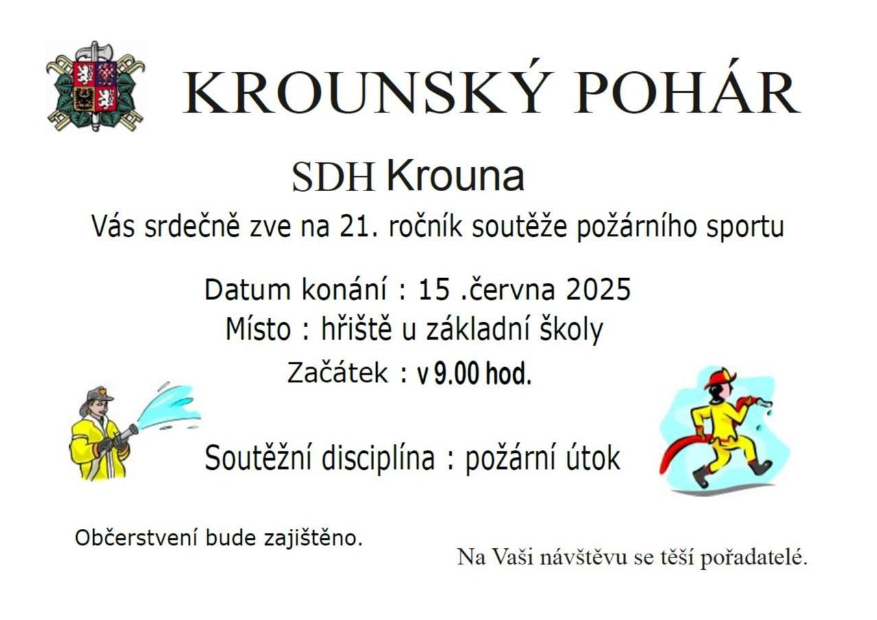 Sbor dobrovolných hasičů Krouna vás srdečně zve na 21. ročník soutěže požárního sportu. Akce se koná 15. června 2025 od 9:00 hodin na hřišti u základní školy. Soutěžní disciplínou bude tradiční požární útok, který slibuje napínavé chvíle a zábavu. Občerstvení pro návštěvníky je zajištěno, a pořadatelé se těší na vaši účast.