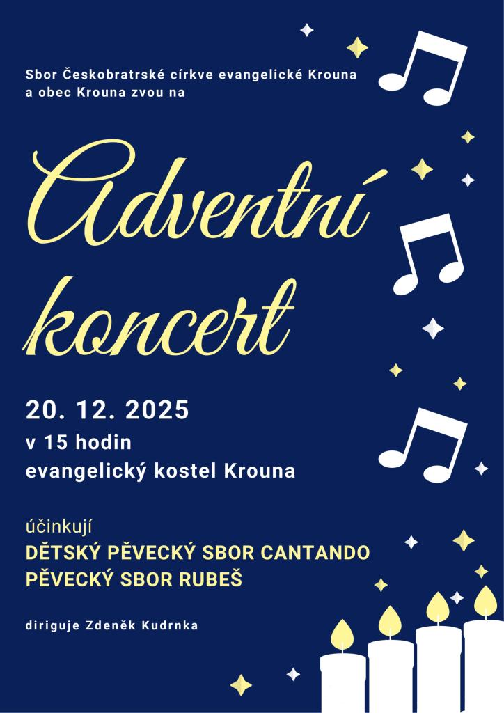 Sbor Českobratrské církve evangelické Krouna a obec Krouna zvou na Adventní koncert, který se uskuteční 20. prosince v 15:00 v evangelickém kostele v Krouně.