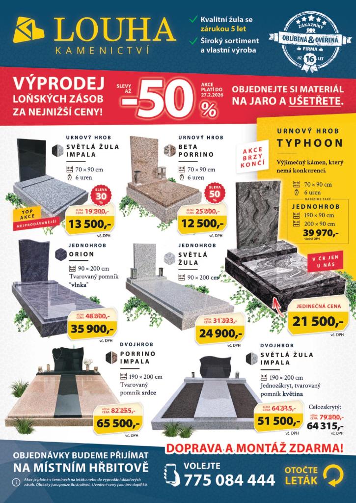 Ve čtvrtek 5. a 19. února přijede na katolický hřbitov zástupce Kamenictví Louha s.r.o. v čase od 12:20 do 12:40. Firma nabízí nové žulové hroby, krycí desky, rovnání pomníků, čištění a renovaci terasových hrobů a obnovu písma (kompletní kamenické práce za velice příznivé ceny - slevy až 50%). Pokud máte zájem, přijďte ve čtvrtek 5. a 19. února v čase od 12:20 do 12:40 na katolický hřbitov, kde Vám bude k dispozici zástupce společnosti.