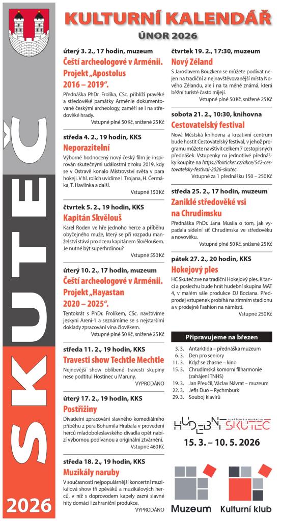 Město Skuteč vás srdečně zve na kulturní akce, které se konají v průběhu února.