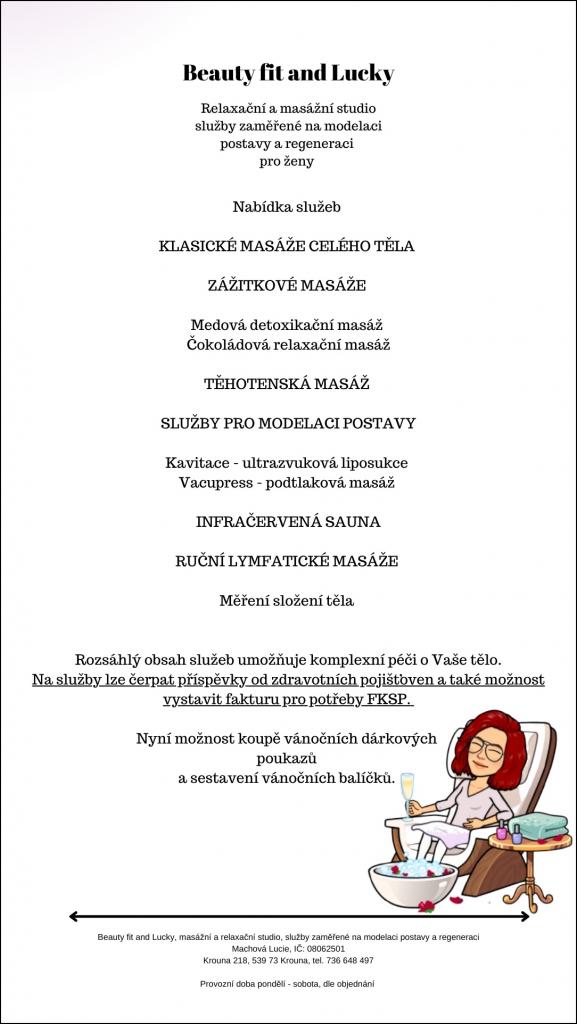 Beauty fit and Lucky je relaxační a masážní studio, které nabízí služby pro ženy na modelaci postavy a regeneraci.