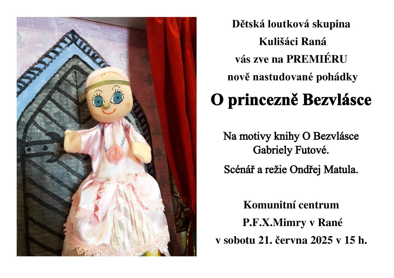 Dětská loutková skupina Kulišáci Raná vás zvou na jedinečnou premiéru pohádky O princezně Bezvlásce, která byla nově nastudována na motivy knihy Gabriely Futové. Scénář a režie se ujmul Ondřej Matula. Akce se koná v sobotu 21. června 2025 v 15 hodin v komunitním centru P.F.X. Mimry v Rané, kde se můžete těšit na zábavné odpoledne plné kouzelných příběhů.