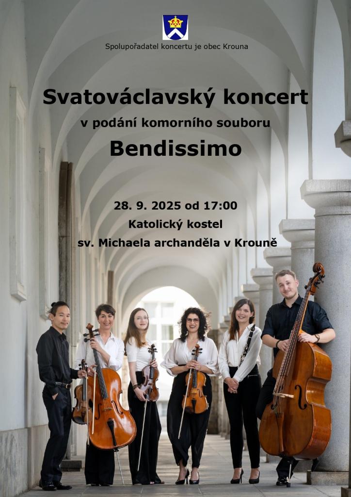 Komorní soubor Bendissimo a obec Krouna Vás srdečně zvou na koncert, který se bude konat 28. září od 17:00 v Katolickém kostele sv. Michaela Archanděla v Krouně.