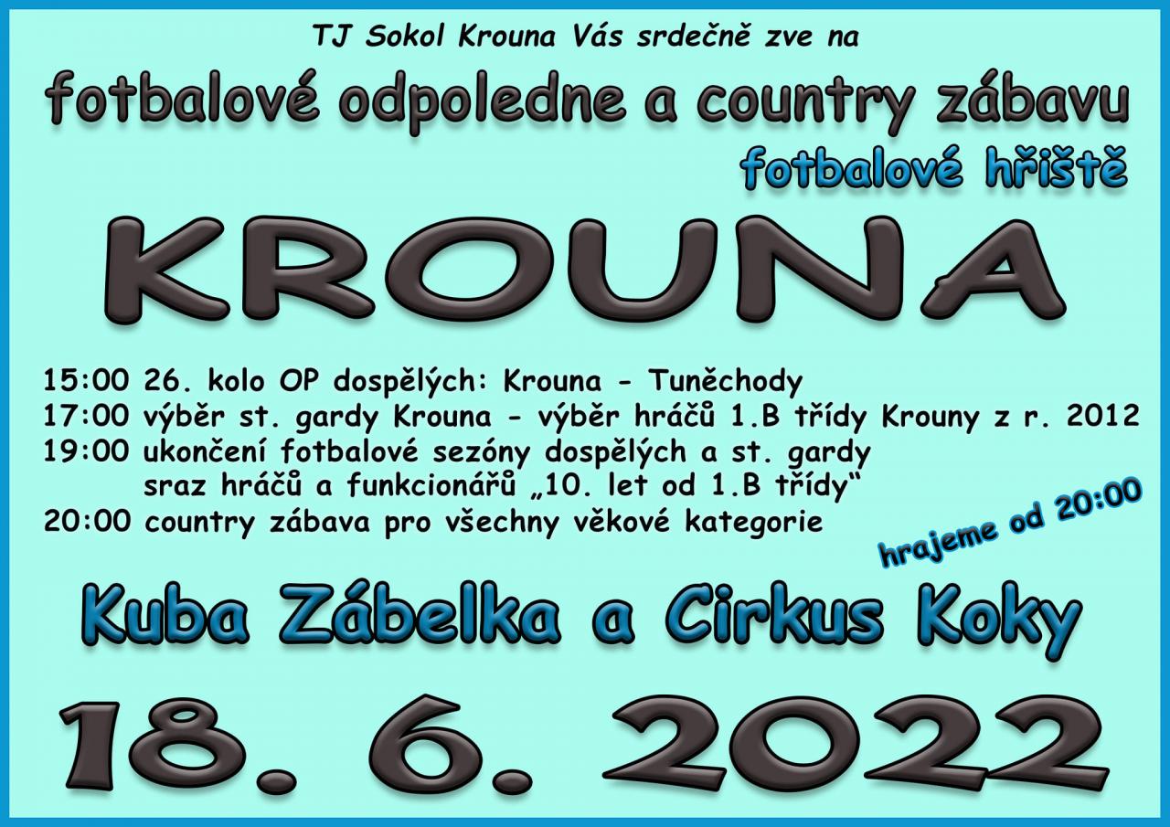 TJ Sokol Krouna si Vás dovoluje pozvat tuto sobotu 18.6.2022 na fotbalové odpoledne a country večer s kapelou Kuby Zábelky.