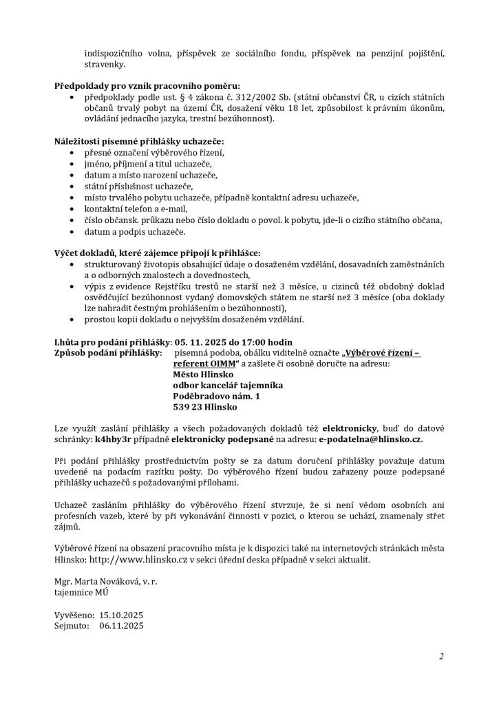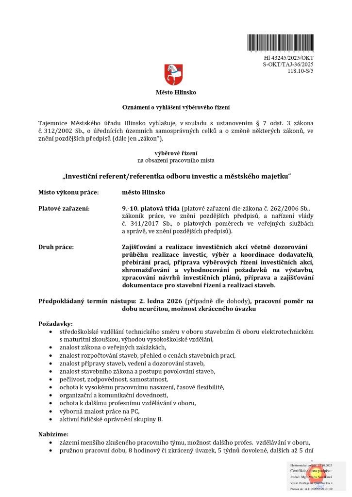 Výběrové řízení na obsazení pracovního místa „Investiční referent/referentka odboru investic a městského majetku“