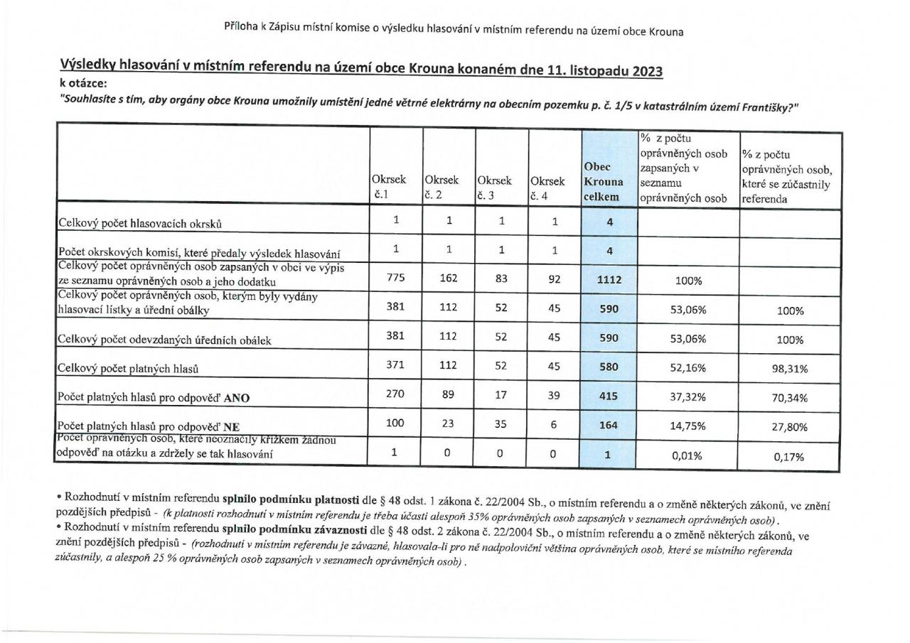Přinášíme výsledky hlasování v místním referendu k otázce: "Souhlasíte s tím, aby orgány obce Krouna umožnily umístění jedné větrné elektrárny na obecním pozemku p. č. 1/5 v katastrálním území Františky?" Podrobné výsledky naleznete v přiložené tabulce.