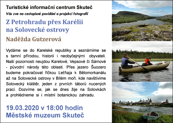S RNDr. Naděždou Gutzerovou se vydáme do Karelské republiky a seznámíme se s tamní přírodou, historií i neobyčejnými obyvateli. Naší pozornosti neujdou Karelové, Vepsové či Sámové – původní národy této oblasti. Přes jezero Šuozero budeme pokračovat říčkou Leťňaja k Bělomorkanálu až na Solovecké ostrovy v Bílém moři, kde navštívíme Solovecký kláštěr, jeden z prvních táborů nucených prací. Dozvíme se, jak se dnes žije na Solovkách a prohlédneme si i místní botanickou zahradu. Cestou zpět se zastavíme ještě na ostrovech Kuzovy.
