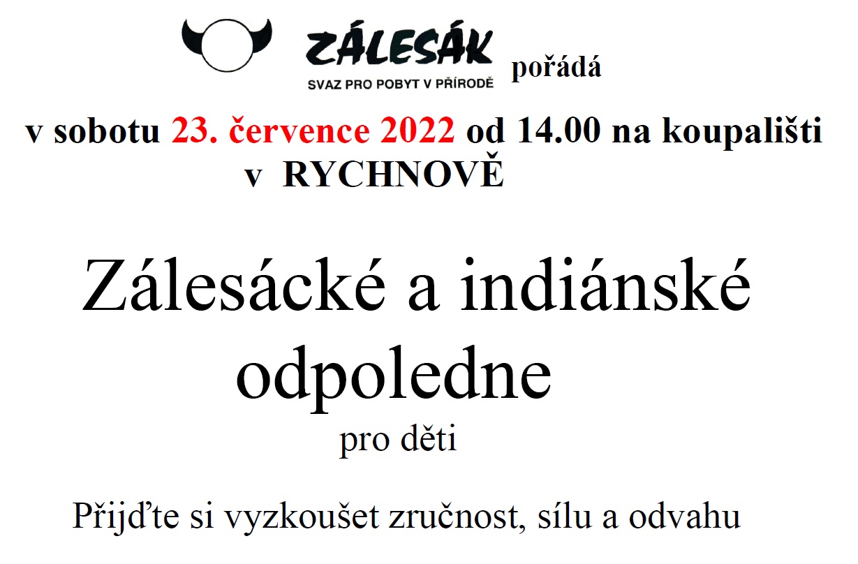 Zálesák - Svaz pro pobyt v přírodě pořádá v sobotu 23. července 2022 od 14.00 na koupališti v Rychnově "Zálesácké a indiánské odpoledne" pro děti.